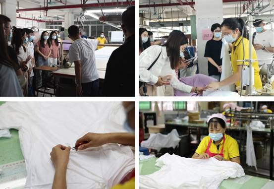 移步生产车间,生产车间的主管从验布工序讲起,带领大家近距离了解制衣工序。大家在了解制衣知识的同时,也体会到制衣一线工人的辛勤付出,一件衣服的诞生凝聚了智慧与汗水,实属不易!