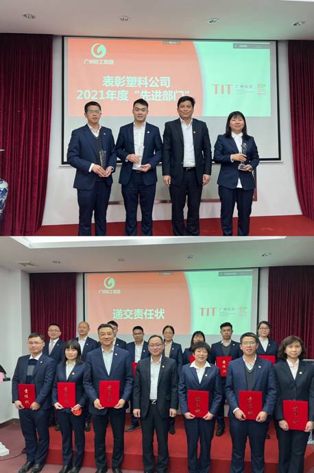 随后,会议对2021年度先进部门、先进个人及建言献策奖进行表彰,并举行了2022年党风廉政建设、维稳综治、计划生育、经营目标、安全生产、环境保护等责任书的递交仪式。