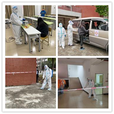 疫情防控演练:模拟学院接到学生核酸检测报告疑似阳性电话后,学院立即启动应急处置,要求学生原地等待进一步处置,校园实施封闭管控,所有人员不得外出,校医立即到学生所在处,引导该生前往隔离观察点,等候三人小组到来将该学生转移至医院隔离、并进行密切接触者排查以及进行校园环境消杀。