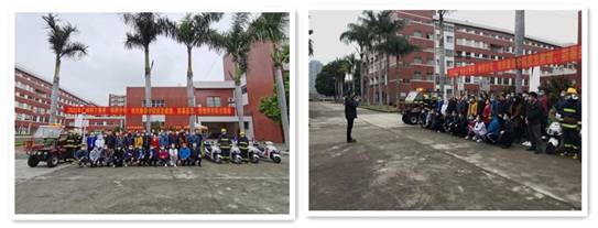 消防应急救援演练:模拟学院内一高层教学楼因电器线路短路引发的火灾事故,学院消防监控室发现房间烟感器联动报警后,立即通知松北安全生产管理办公室,以及立即启动广州大学纺织服装学火灾事故应急处置预案,学院保安组马上使用灭火器进行初期火灾事故的灭火救援。松北安全生产管理办公室接报校园的警情后集中着装,并迅速驾驶消防摩托车前往火灾现场接驳水源、消防摩托车加压对火灾事故点进行灭火救援。过程中,因火灾楼层逃生(通道)被火围堵不能正常逃生,马上设置逃生气垫进行模拟逃生救援。经过及时的灭火救援行动,最终扑灭灭灾事故点火情,避免人员伤亡财产损失。