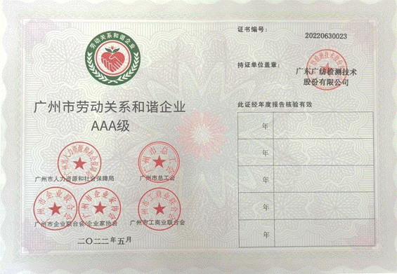近日,按照《广州市创建劳动关系和谐单位评审管理办法》要求,经各区劳动关系三方协商会议初审、市劳动关系三方协商会议复审,广东广纺检测技术股份有限公司获得“广州市劳动关系和谐企业AAA级”荣誉称号。这是广纺检测继2021获得“广州市劳动关系和谐企业AA级”后的又一殊荣,是对广纺检测劳动关系体制机制、维护职工权益、创造和谐劳动氛围等多方面的肯定。