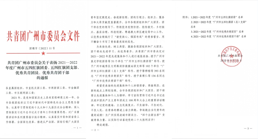 近日,共青团广州市委员会、广州轻工集团团委分别开展了2021-2022年度优秀团员、优秀团干部及先进团组织评选表彰活动,新利在线官网一批先进集体和个人受到表彰。