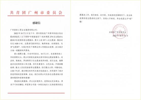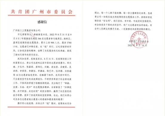 志愿者们临危受命、逆行出战,充分践行了“奉献、友爱、互助、进步”的志愿服务精神,全面彰显了“共防疫情、共守家园、共克时艰”的担当情怀,赢得了居民群众的称赞认可,筑牢了防疫网络的坚固屏障。近日,公司收到团市委发来的两封感谢信,不仅肯定了参与过志愿服务的团员青年的辛勤付出,更鼓舞了其他团员青年立志向先进榜样学习看齐。