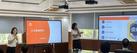 接着,新利在线官网办公室张淑琼经理从公文的定义、格式、行文规则、常见文种写作要点四个方面,借助案例分析、举例等方式,绘声绘色地介绍了公文写作的相关知识,并提醒大家着重注意过程中可能出现的错误。周洁娴则从档案的收集,到文书档案、声像档案、实物档案的整理,再到档案的保存,条分缕析地讲述了档案管理的细则。在他们两位的讲解下,我司职工对公文写作和档案管理有了更全面的认识,一定程度上拓宽了自己的知识面。